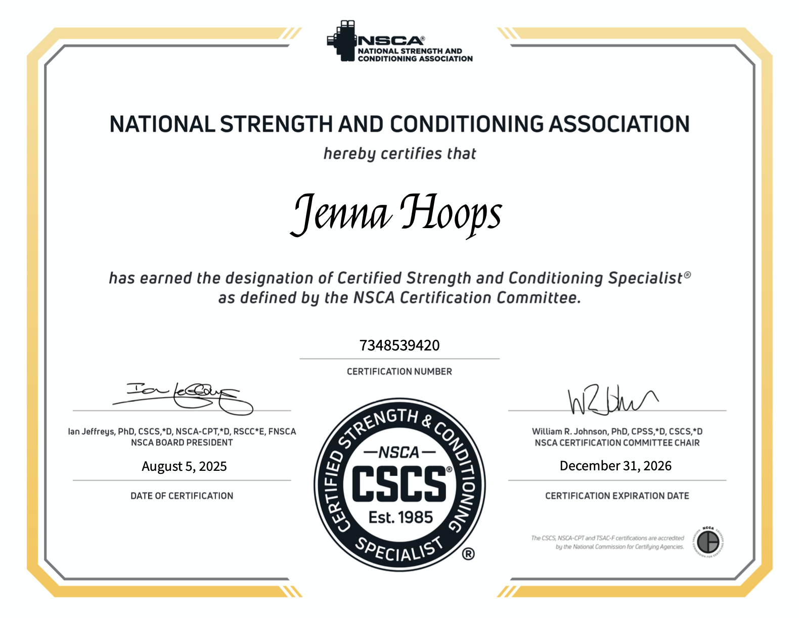 Hi there! My name is Jenna Hoops. I am a certified strength and conditioning specialist. I would love to tell you a bit more about myself and how I got to where I am today!