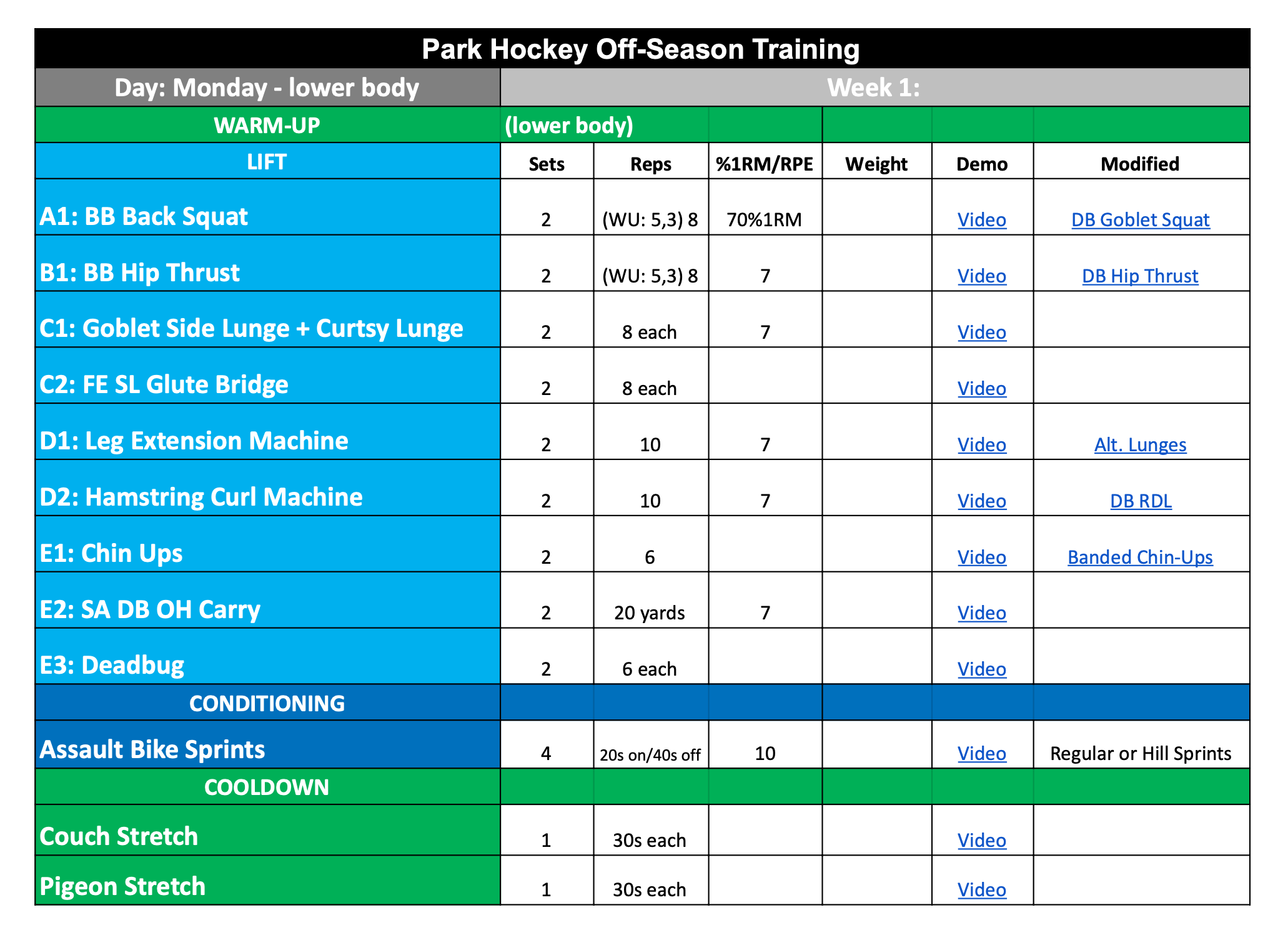 This pdf contains weeks 13-16 of the program. This is the strength/power block. For each training session, begin with the warm-up sheet and then follow along with this document. Every movement has a video demonstration for your convenience. Feel free to print, or use digitally.