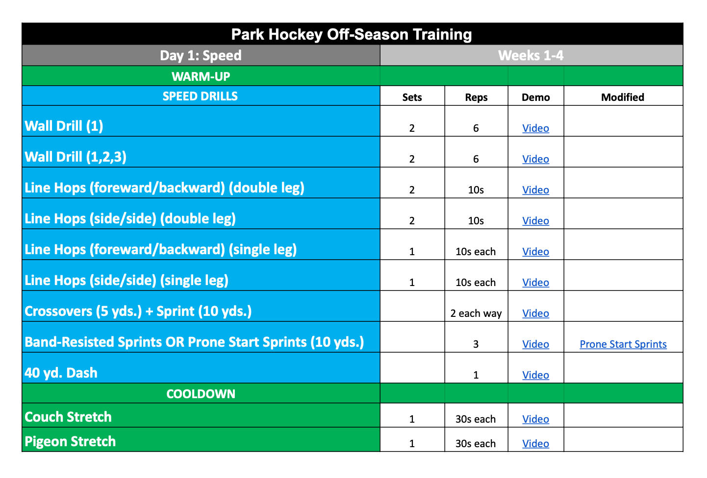 This program is structured into 2 training days per week; day 1 focuses specifically on speed work, while day 2 focuses specifically on change of direction (COD) work. If you are also engaging in the Option 1 strength and conditioning program, it is preferred to follow this program on Wednesday and Saturday each week. If you are also engaging in the Option 2 strength and conditioning program, it is preferred to follow this program on Tuesday and Thursday each week. Each 4-week block includes a dynamic warmup, speed and change of direction drills, and cool-down. Every drill has a video demonstration for your convenience. You should plan to spend 60-90 minutes in the gym or on the field on either day.