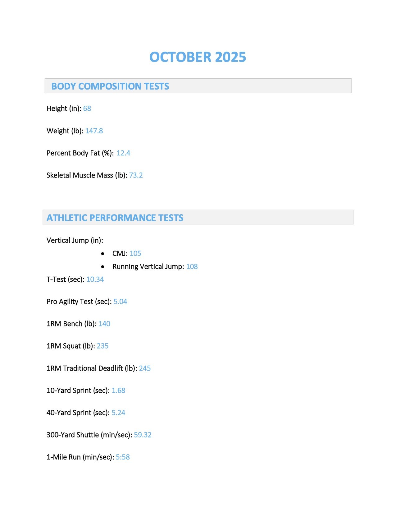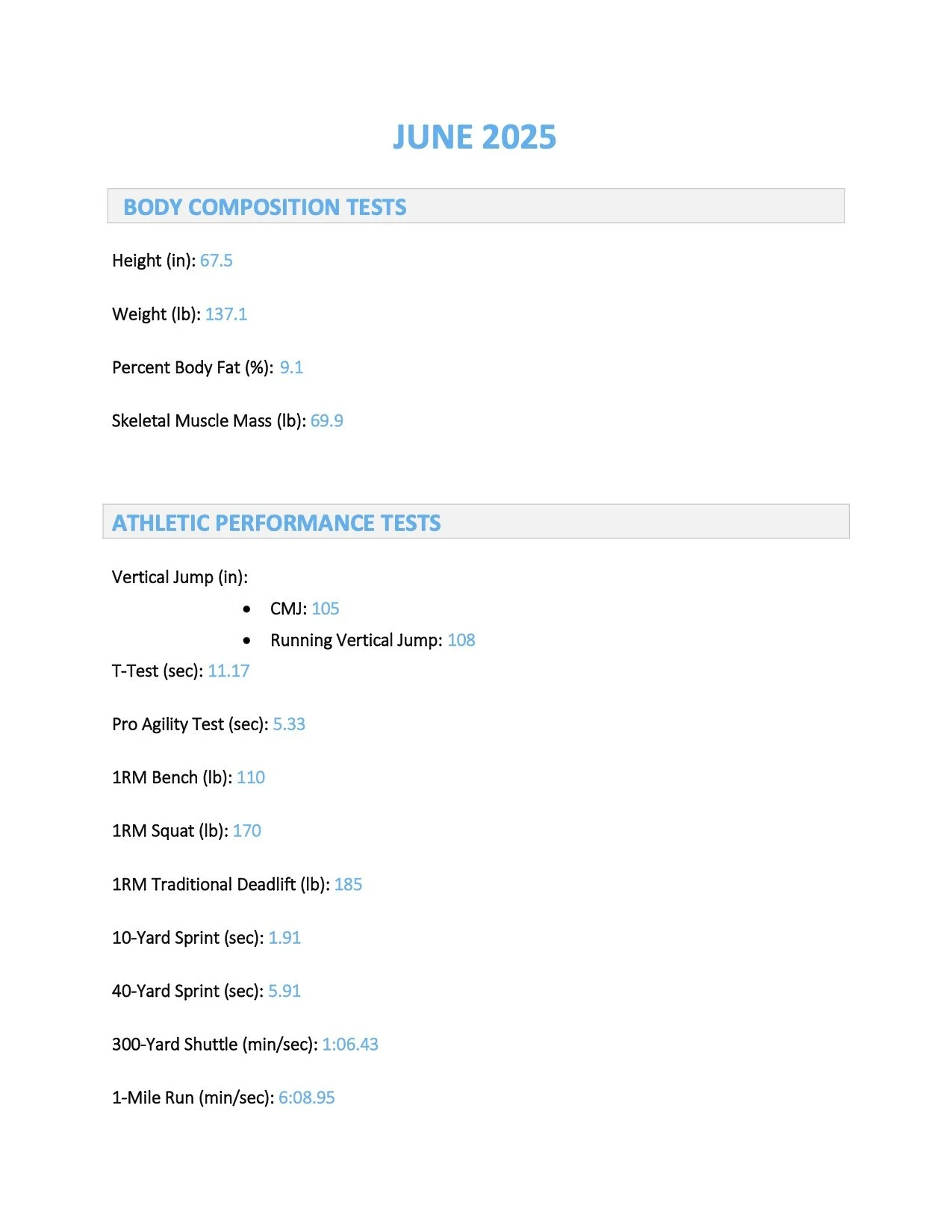 Chase is a 15-year-old hockey and golf athlete who followed along with my 4 times a week strength and conditioning program. He came to me wanting to get bigger, stronger, and faster for the upcoming hockey season. Over the summer, he stayed consistent with the program and saw dramatic results. Chase accomplished all of his goals over the summer and even improved on every exercise test we conducted (except for vertical jump, which remained the exact same), proving he got bigger, stronger, and faster all within one summer of training. The data doesn’t lie!